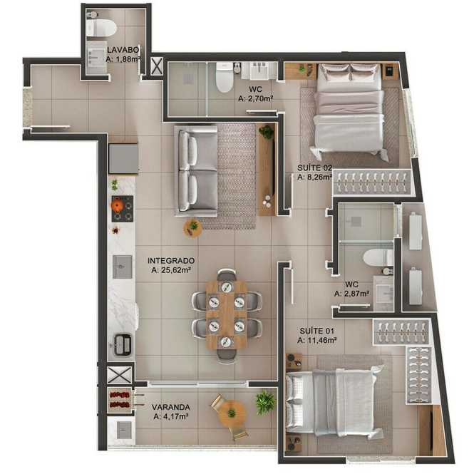 Planta 02 - 2 dorm 61 08m²