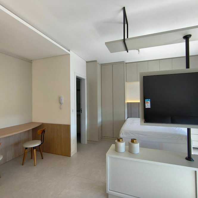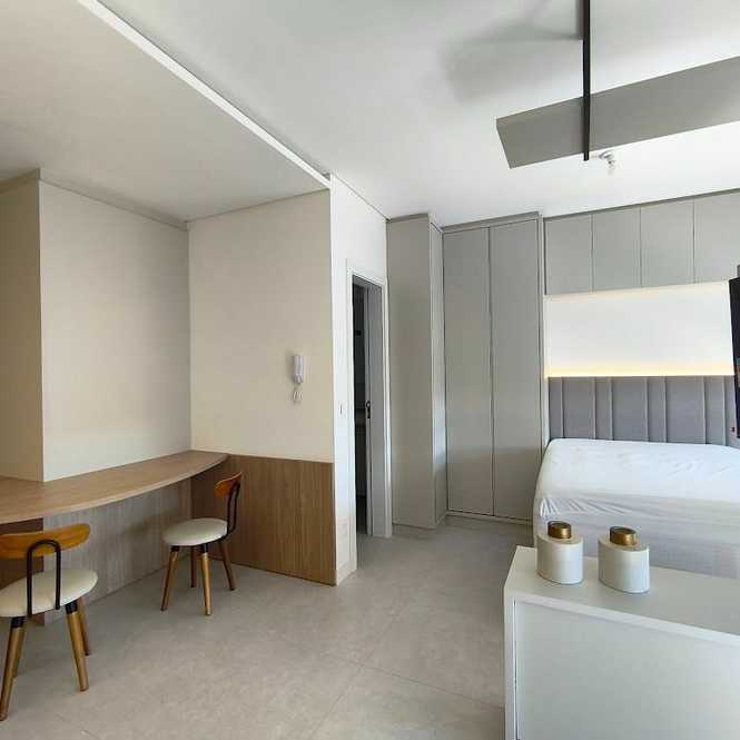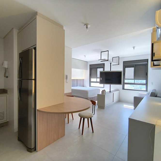 Este studio de 39m² é um convite ao bem-viver. Com um design moderno e funcional, já vem completamente mobiliado e equipado com tudo que você precisa: cozinha com geladeira e cooktop, máquina de lavar, ar-condicionado e banheiro com box blindex. Cada detalhe foi pensado para proporcionar uma experiência única de conforto e estilo.
