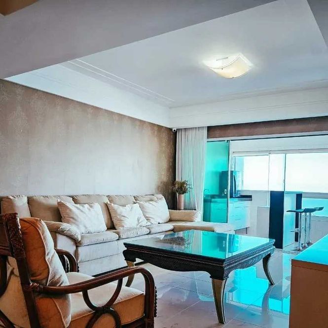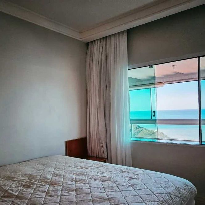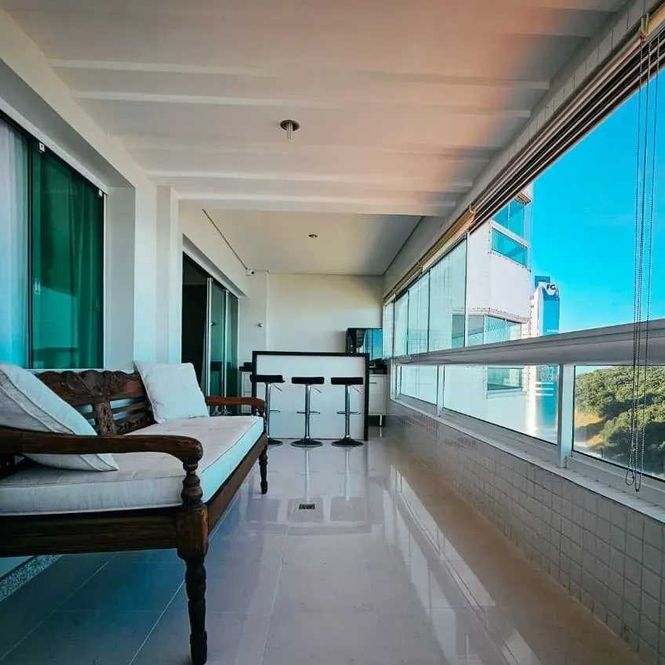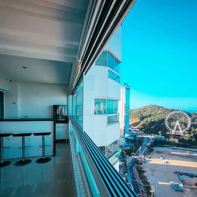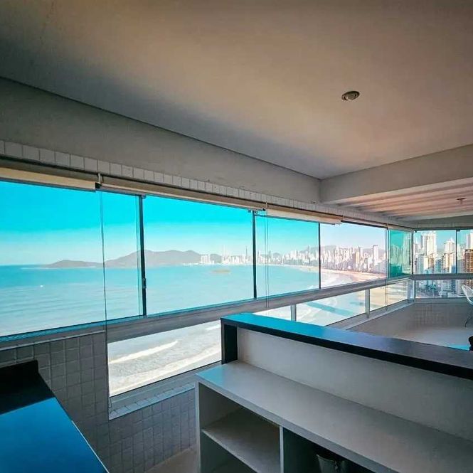 -Living integrado à sacada com vista panorâmica de 180° para o mar