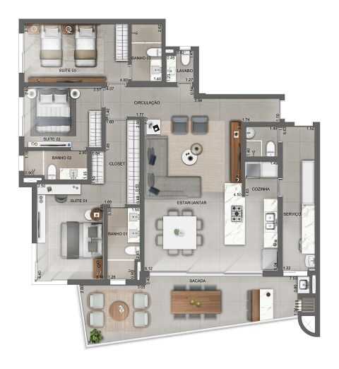 - 3 Dormitórios, todos suítes, garantindo privacidade e conforto.