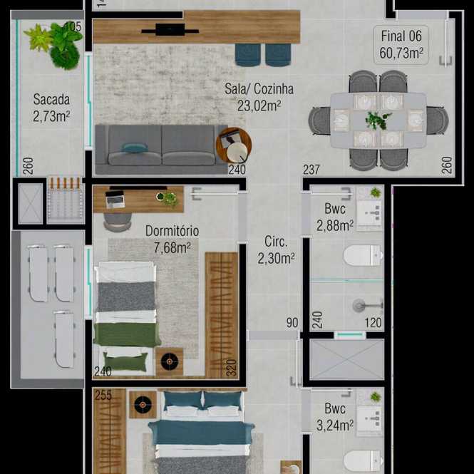 Planta 01 - 2 dorm 60,73m²