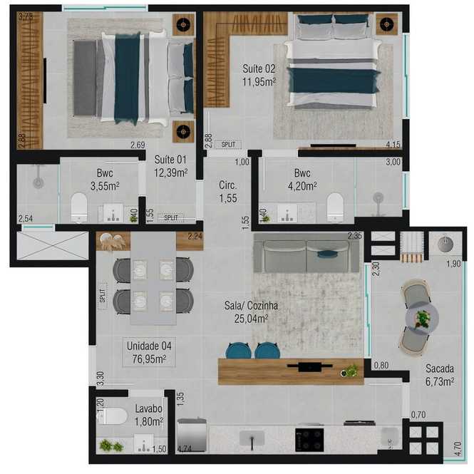 Planta 02 - 2 dorm 76,95m²