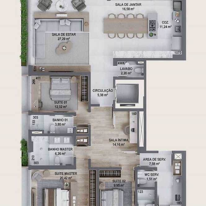 - **3 Dormitórios** com 3 Suítes para o máximo de conforto e privacidade