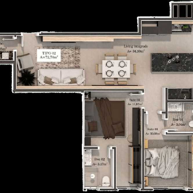 Planta 03 - 2 dorm 77m²