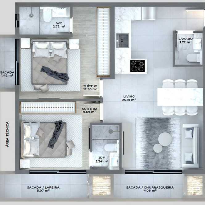 Planta 07 - 2 dorm 71,40m² - garden