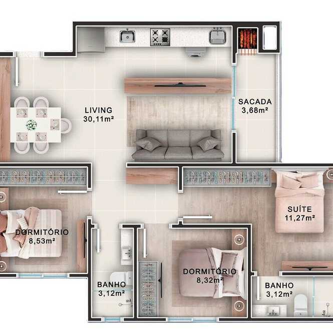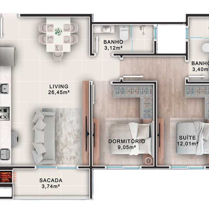 Planta 03 - 2 dorm 64,28m²